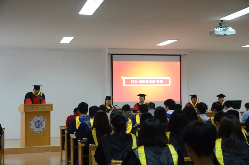 李同春院长为毕业典礼致辞,向各位毕业生表示热烈的祝贺,向不辞辛苦教书育人的老师们表示衷心的感谢。李院长结合对新成立的农工院的时代需求、历史背景、院系发展及学科特色等方面的介绍,寄语毕业生们承担起国家赋予他们的责任,怀有大理想、大志向,时刻心系农村水利,心系那一片绿野。李院长希望毕业生们能够虚怀若谷,目光远大,能够恪守道德,做好本分,能够认识时代,引领潮流,过着不负此生的生活:朴实地生活,高尚地生活,谦卑地生活。