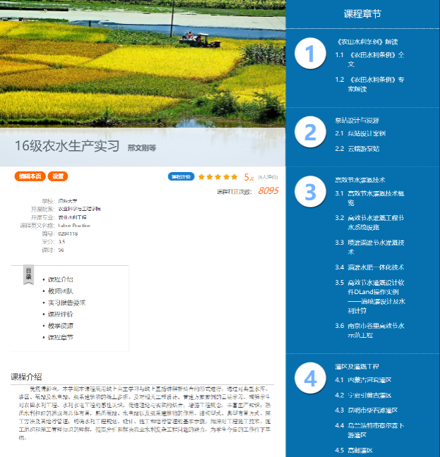 本次线上实习直播教学内容包括和凤镇高标准农田建设工程、和凤镇塘坝清淤工程、环山河水利工程、章西圩排涝泵站工程、大新塘河道整治工程、方便灌区河道整治工程、三堡排涝工程、浙江省灌溉试验中心站-江东农水试验基地、铜山源水库灌区等。实习教师亲赴实习现场,以网络连通千里,用摄影镜头带领学子“身临”工程实景。线上直播,实习教师变身“网红”主播,连线大咖,工程专家成为“特邀”嘉宾,通过现场讲解工程的建设目的、建设内容、设计方案、施工情况、建设现状、管护措施、预期成效等内容,生动地介绍了实际工程案例和施工经验教训,讲授了工程建设过程中应用到的新理念、新技术,并在线解答同学们提出的问题,带来一场场内容充实、形式新颖的生产实习直播课程。