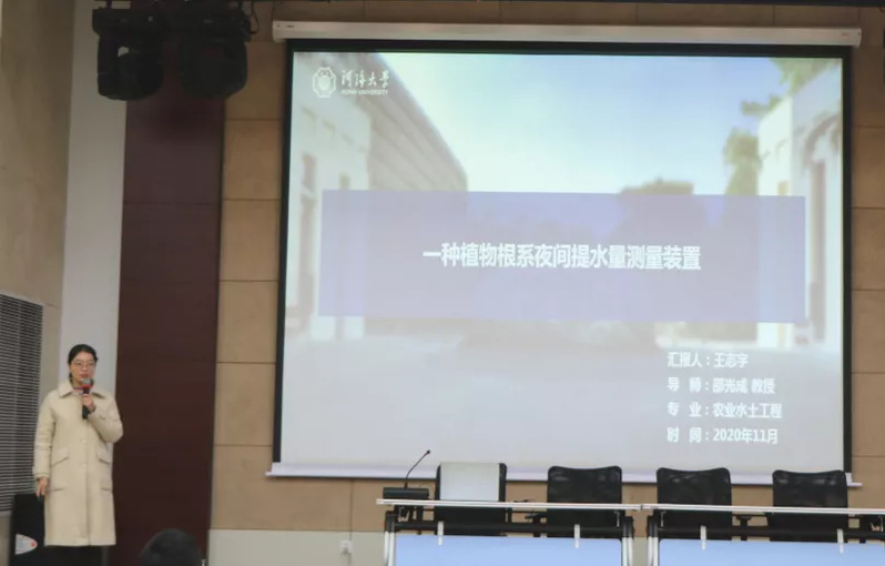 王志宇同学介绍了一种植物根系夜间提水量测量装置,她以专利破题,汇报内容新颖、生动,汇报思路清晰,重点突出,在众多选手中脱颖而出。