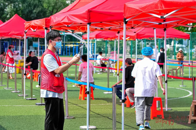 在核酸检测中,王凯瑞同学作为负责人永远冲在前面,维持检测队伍的秩序。炎热的天气抵挡不住他的热情,像他一样的志愿者在大筛查中,服从命令,统一行动,工作兢兢业业、科学高效,志愿红坎肩与医务人员的白衣交相辉映,成了一道流动的美丽风景。