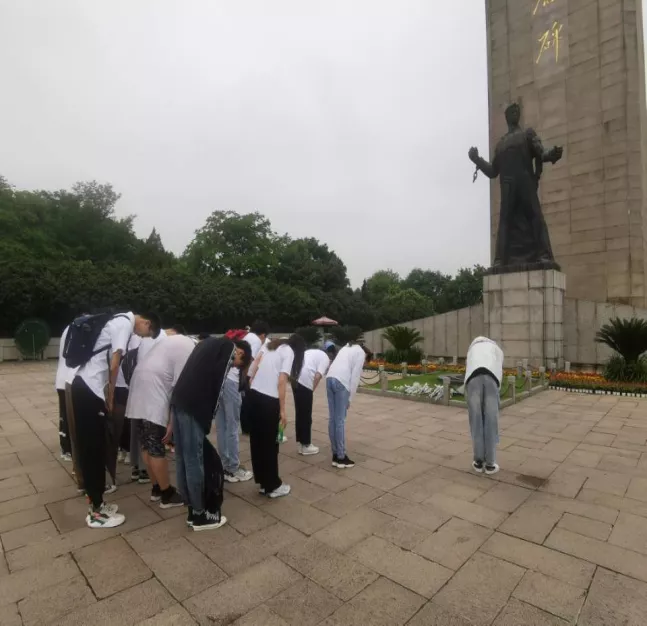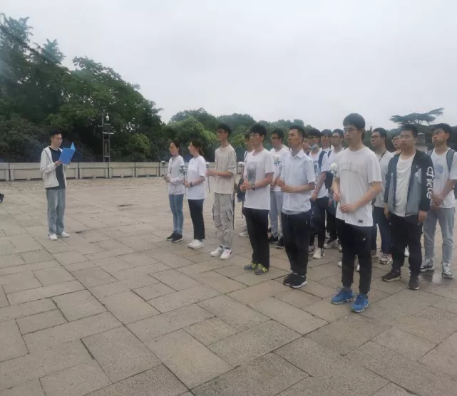 23日中午12:15,全体团员统一着白色上衣,穿戴整齐在东门集合,统一前往雨花台烈士纪念馆。入园便是“庆祝中国共产党成立100周年”的花坛,团支部在此合影留念。