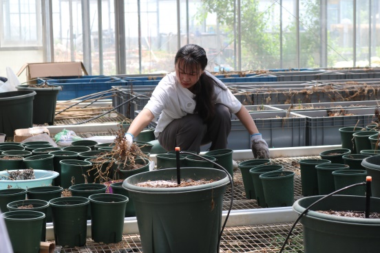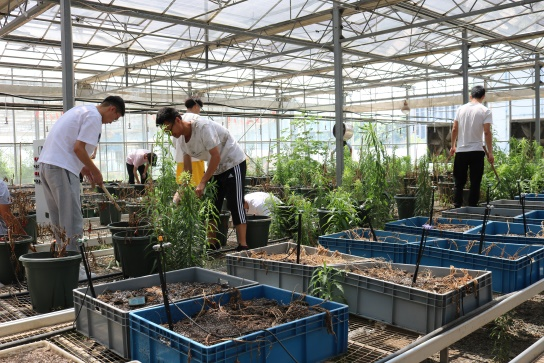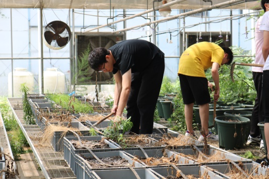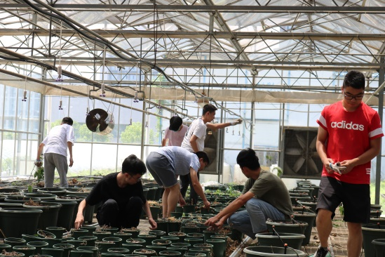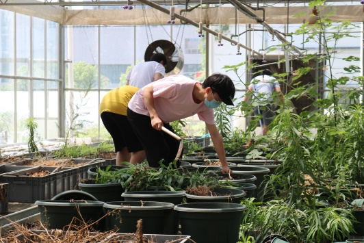 负责人讲述完相关要求后,同学们自主拿起工具和手套,分成两大组,一组同学负责清理左侧台架区的杂草,一组同学负责清理右手边盆栽区的杂草。