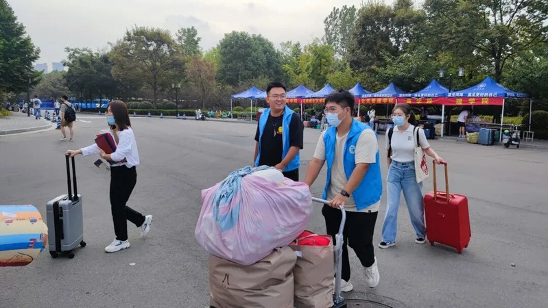 新生抵达南门后,在工作人员的指引下,依次完成“体温监测、身份验证、苏康码查验”等流程后进入校园,来到学院服务点,现场志愿者进行问题解答,并帮助新生贴行李标签、运送行李、送达宿舍区。