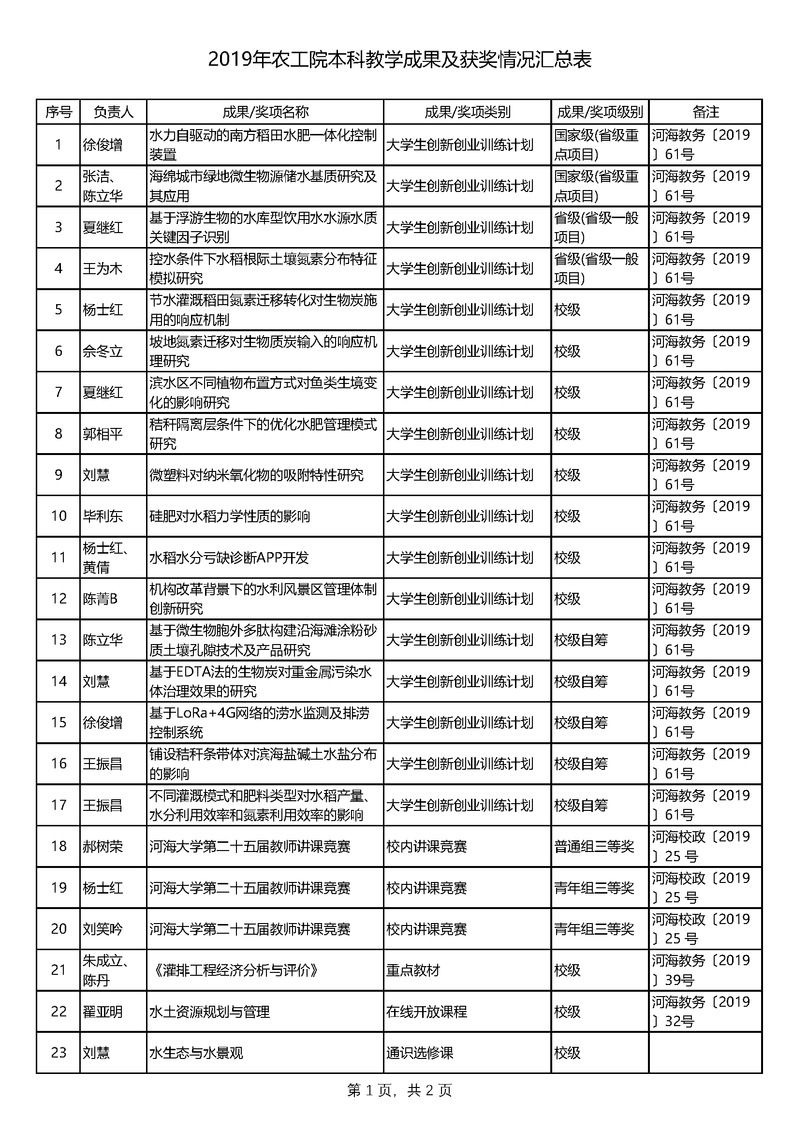2019年农工院本科教学成果及获奖情况汇总表