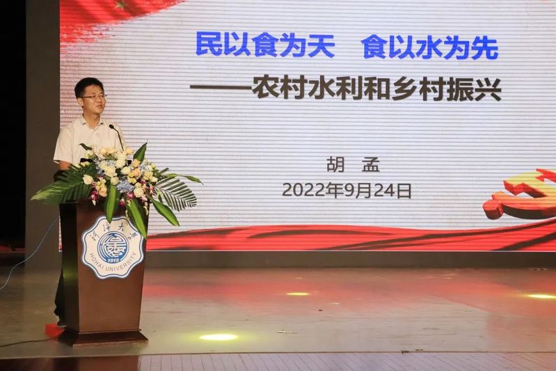水利部农村水利水电司农村供水处处长、教授级高工胡孟作“民以食为天,食以水为先——农村水利与乡村振兴”特邀报告。他深入浅出地向大家介绍了中国现阶段保障粮食安全、饮水安全的重要性,以及乡村振兴新形势新要求,并明确指出乡村振兴中农村水利大有作为。作为“全国脱贫攻坚先进个人”和“最美水利人”,胡孟处长结合自己的工作经历,指出“人是要有一点精神的”,从“平凡”走向“非凡”需要沉下心扎根基层工作、需要无私奉献和爱民情怀。最后他勉励同学们要珍惜大学美好时光,激励大家学海无涯,百舸争流千帆竞;岁月如歌,乘风破浪万里行。