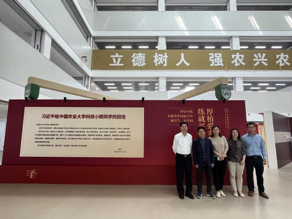 调研座谈会前,朱成立书记一行在牛俊副院长陪同下到中国农业大学图书馆参观了“厚植爱农情怀 练就兴农本领”科技小院专题成果展,认真学习了习近平总书记给中国农业大学科技小院同学的回信精神。