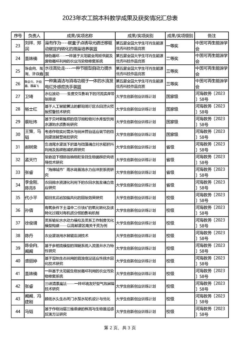 2023年农工院本科教学成果及获奖情况汇总表