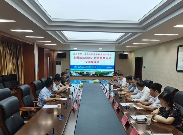 在湖北水利水电职业技术学院,全体校院级领导参加会议,作为全国清洁能源产教融合共同体成员,双方就进一步深化人才培养改革、科研平台建设和科研项目合作等方面展开讨论,了解涉农、涉水的科研需求。