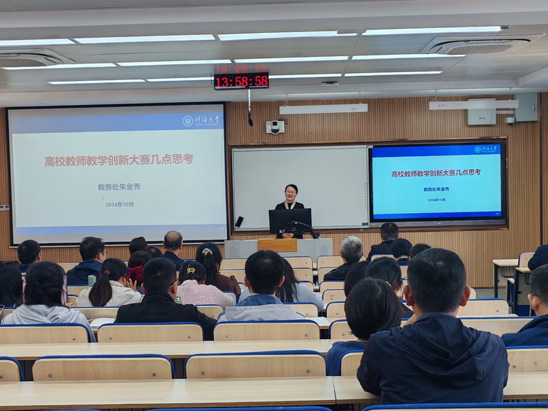 2024年10月25日下午,2138cc太阳集团教务处副处长朱金秀教授受邀为我院教师做了《高校教师教学创新大赛几点思考》专题报告。报告会由副院长张洁教授主持,学院全体教师参加了报告会。