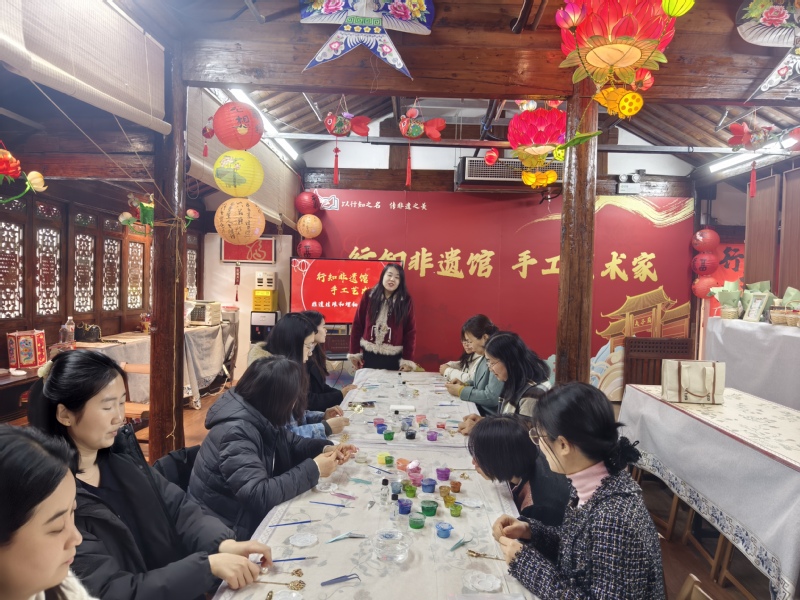 工会委员带领女教职工走进行知非遗文创馆,共同感知美、创造美、传承美。首先,老师们参观了漆扇、云锦、剪纸、折扇、珐琅等非遗文创产品。然后听取了文创馆负责人关于非遗文化的讲解和详细的珐琅、螺钿工艺制作流程。随后,老师们发挥想象力和创造力,运用珐琅和螺钿工艺亲手制作了属于自己的首饰。