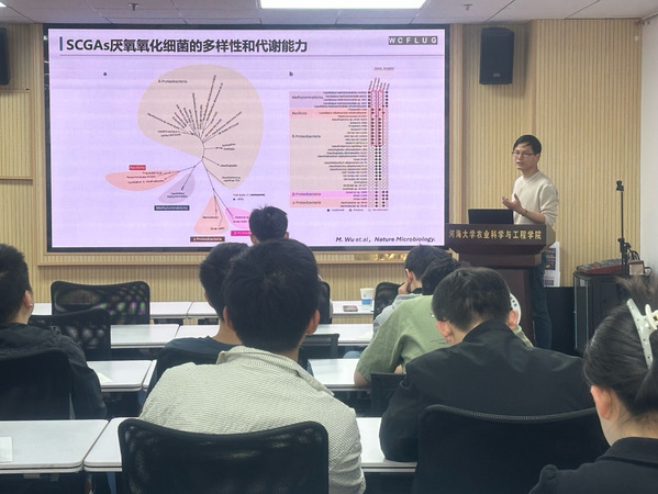伍孟雄老师凭借深厚的专业知识,围绕短链气态烷烃的微生物厌氧氧化展开深入讲解。伍孟雄老师介绍了甲烷、乙烷等短链气态烷烃作为温室气体以及微生物重要碳源在环境科学领域的重要意义,分享了通过厌氧 SCGAs 氧化耦合硝酸盐还原微生物的富集培养、稳定态同位素实验等前沿研究方法取得的成果。
