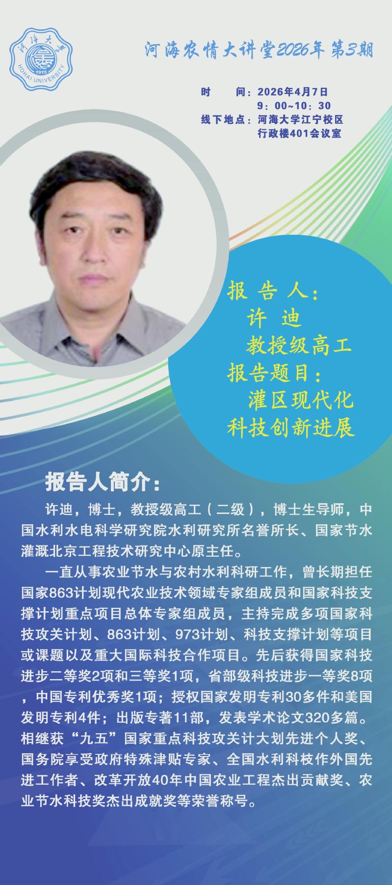 许迪,博士,教授级高工(二级),博士生导师,中国水利水电科学研究院水利研究所名誉所长、国家节水灌溉北京工程技术研究中心原主任。一直从事农业节水与农村水利科研工作,曾长期担任国家863计划现代农业技术领域专家组成员和国家科技支撑计划重点项目总体专家组成员,主持完成多项国家科技攻关计划、863计划、973计划、科技支撑计划等项目或课题以及重大国际科技合作项目。先后获得国家科技进步二等奖2项和三等奖1项,省部级科技进步一等奖8项,中国专利优秀奖1项;授权国家发明专利30多件和美国发明专利4件;出版专著11部,发表学术论文320多篇。相继获“九五”国家重点科技攻关计大划先进个人奖、国务院享受政府特殊津贴专家、全国水利科枝作外国先进工作者、改革开放40年中国农业工程杰出贡献奖、农业节水科技奖杰出成就奖等荣誉称号。
