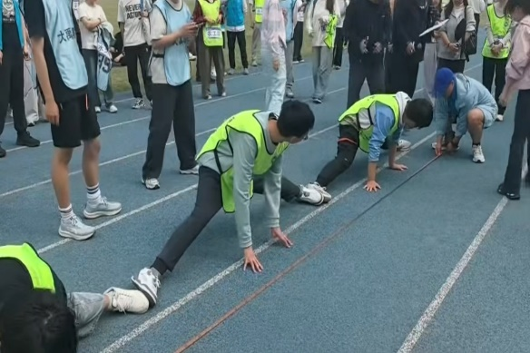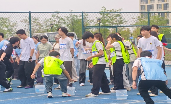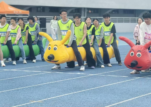 学院代表队参与的“毛毛虫”“南水北调”“腰缠万贯”“最长的腿”等集体项目,以整齐的节奏、高效的协作和不服输的劲头,在赛场上留下精彩瞬间。“毛毛虫”项目里,5名队员骑跨彩色充气道具,口号整齐、步伐一致,如一条灵动的长龙冲向终点;“南水北调”环节,大家手持水杯往返接力,水花飞溅中既有速度的比拼,更有策略的调整,水位在一次次奔跑中不断上升;“腰缠万贯”项目中,队员们腰间传递横幅,如离弦之箭般冲刺折返,每一次交接都扣人心弦;随后的“最长的腿”项目,20名队员脚脚相连,尽力舒展身体、紧密贴合,以最大程度延伸队伍长度,最终斩获“最长的腿”项目第四名的好成绩。